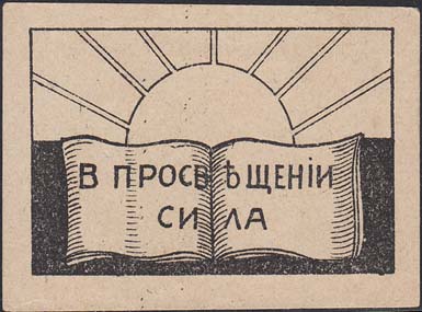 1917(?) г. Разм. рамки 56 х 38 мм. Одноцветная печать на светло-серой бумаге. В прямоугольной рамке в центре раскрытая книга на фоне восходящего солнца. На развороте книги текст в две строки: «В просвещении сила».