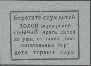 1927(?) г. 54 х 35 мм. Одноцветная печать на серо-синей бумаге. В центре в прямоугольной рамке разм. 40 х 27 мм текст в шесть строк: «Берегите слух детей. Долой варварский обычай драть детей за уши, от таких «воспитательных мер» дети теряют слух».