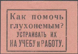 1927(?) г. Разм. 50 х 35 мм. Одноцветная печать розово-серой бумаге. В центре в прямоугольной рамке разм. 40 х 28 мм текст в четыре строки: «Как помочь глухонемым? Устраивать их на учебу и на работу».