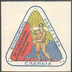 1926 г. 01.121926 г. Республиканский сбор. Разм. 38 х 38 мм. Многоцветная печать на белой бумаге. В двойной треугольной рамке с закругленными краями на фоне восходящего солнца и заводов слепой держит флаг, на котором текст: «Не сожаление, а организованная помощь». По периметру рамки текст: «Всекрым…