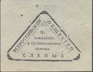 1926 г. 01.12.1926 г. Разм. 50 х 40 мм. Одноцветная печать на плотной серо-зеленой бумаге. В центре в треугольной рамке текст в четыре строки: Не сожаление, а организованная помощь». По внутреннему периметру рамки текст: «Всероссийское общество слепых».