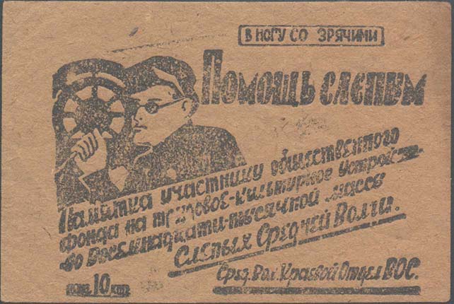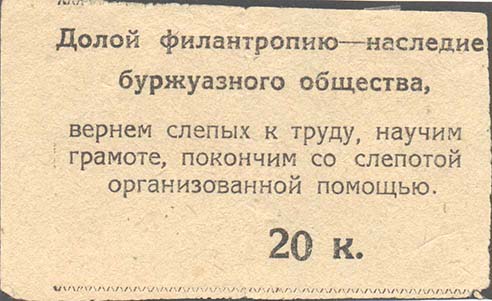 1933 г. Март Разм. 64 х 52 мм. Одноцветная печать на плотной желтой бумаге. Сверху и снизу две волнистые линии. В центре текст в пять строк: «Долой филантропию – наследие буржуазного общества, вернем слепых к труду, научим грамоте, покончим со слепотой организованной помощью». Внизу номинал «20 к.…