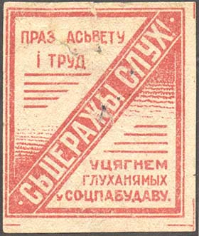 1931(?) г. Разм. 48 х 55 мм. Одноцветная печать на желто-ватой бумаге. В двойной прямоугольной рамке в левом верхнем углу тест в две строки на белорусском языке: «Через просвещение и труд». В правом нижнем углу продолжение теста в три строки на белорусском языке: «Вовлечем глухонемых в социалисти…