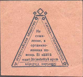 1926 г. Разм. 52 х 55 мм. Одноцветная печать на плотной бумаге различных цветов. В центре в двойной треугольной рамке разм. 37 х 38 мм с декоративными элементами по углам текст на двух языках в три строки: «Не сожаление, а организованная помощь». По периметру между рамками текст на двух языках: «…