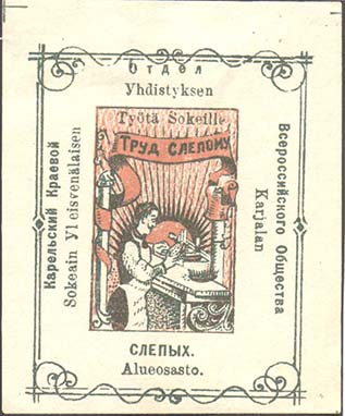 1926 г. Разм. 52 х 55 мм. Одноцветная печать на плотной бумаге различных цветов. В центре в двойной прямоугольной рамке разм. 32 х 32,5 мм с декоративными элементами по углам текст на двух языках в три строки: «Труд и просвещение слепому». Сверху над рамкой текст на двух языках: «Всерос[сийское].…