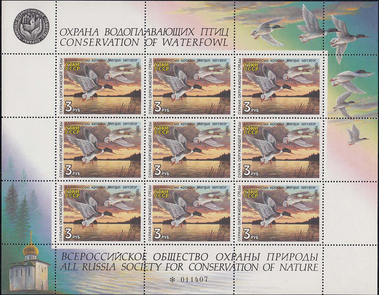 1990 г. Разм. рис. 45 х 32,5 мм. Многоцветная печать на белой мелованной бумаге. Зубц. 12 1/4. С клеем. Две утки, летящих над водоемом. В левом верхнем углу текст в две строки: «Утки СССР». В правом верхнем углу дата: «1990». Сверху текст: «Длинноносый крохаль» и латинское название данного вида у…