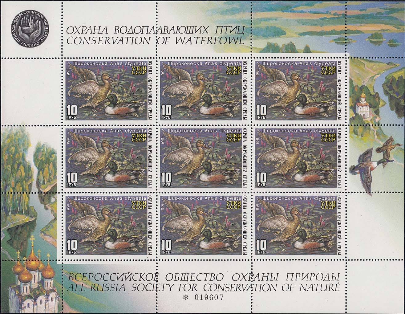1992 г. Разм. рис. 45 х 32,5 мм. Многоцветная печать на белой мелованной бумаге. Зубц. 12 1/4. С клеем. Две утки на поверхности водоема. В правом верхнем углу текст в две строки: «Утки СССР». В левом верхнем углу дата: «1991». Сверху текст: «Широконоска» и латинское название данного вида уток. В …