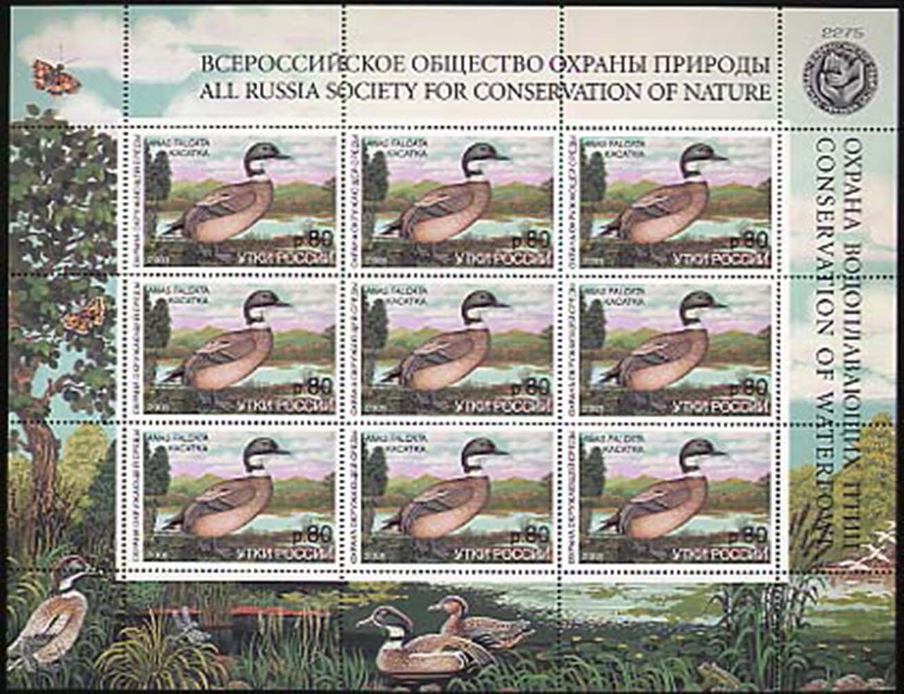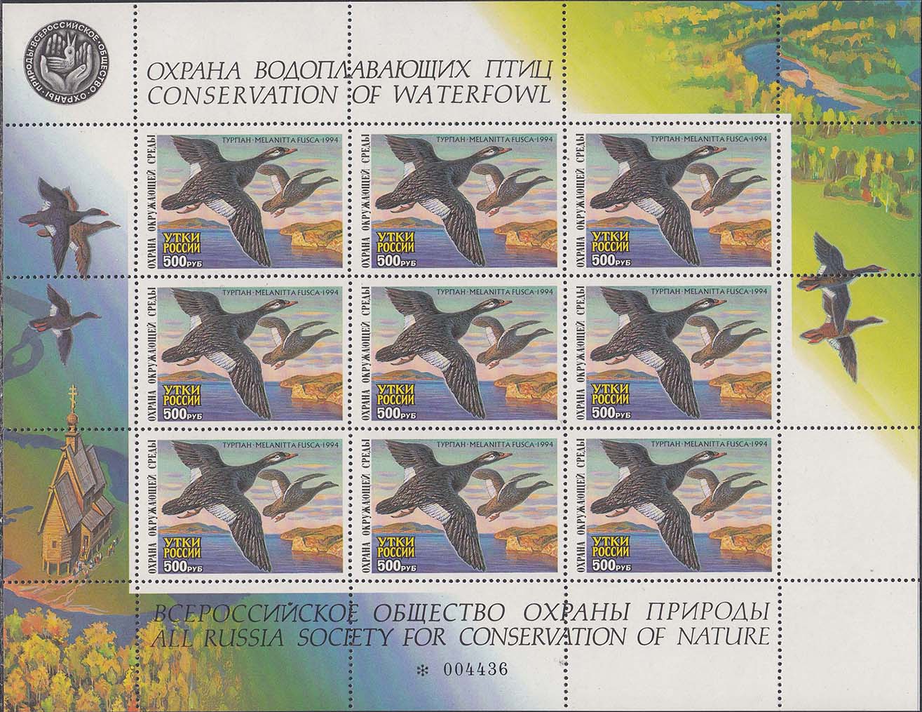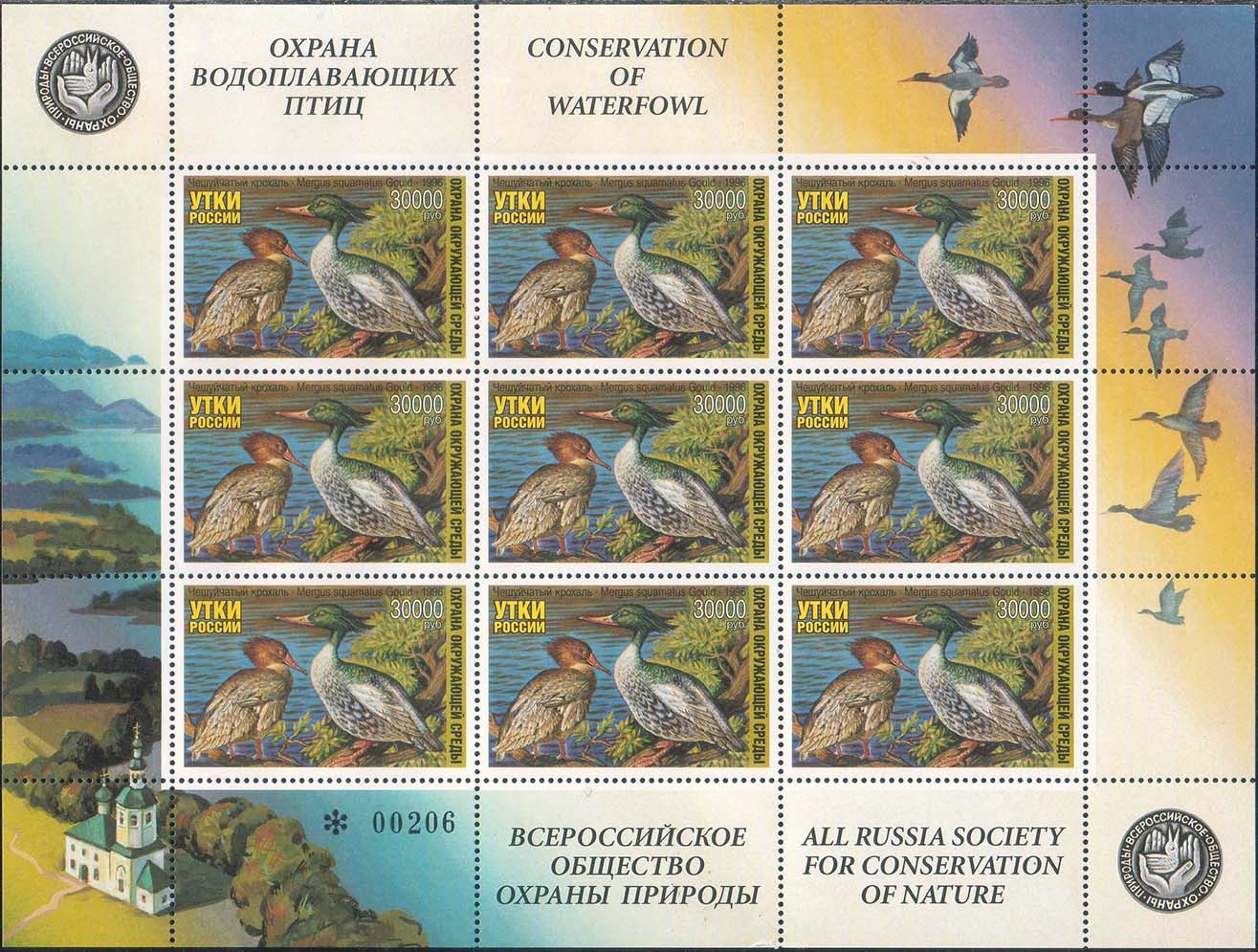 1994 г. Разм. рис. ≈ 47 х 32 мм. Многоцветная печать на белой мелованной бумаге. Зубц. 12 1/4. С клеем. В центре две утки над водоемом. Сверху текст: «Турпан» и латинское название данного вида уток и дата: «1994». В левом нижнем углу текст в две строки: «Утки России» и номинал. Слева вертикально …