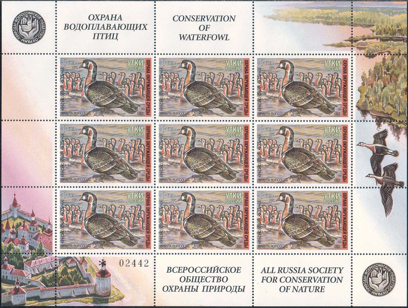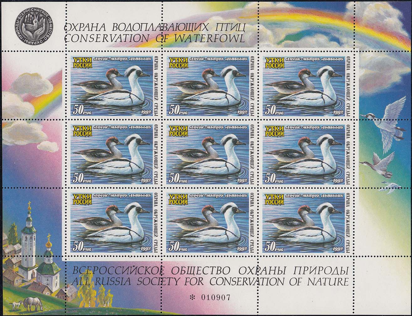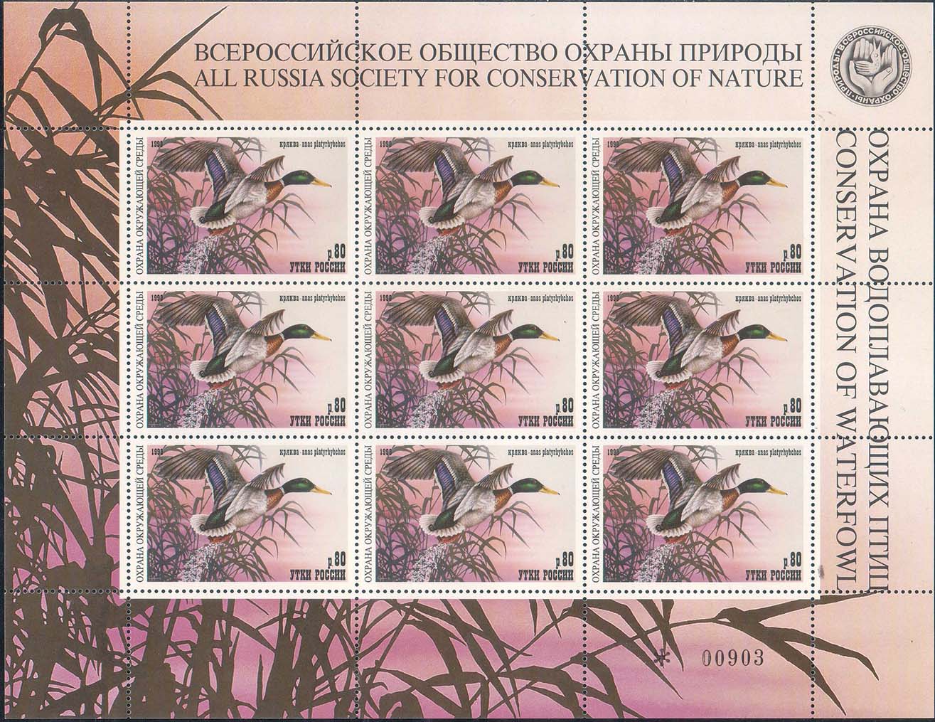 1994 г. Разм. рис. ≈ 47 х 32 мм. Многоцветная печать на белой мелованной бумаге. Зубц. 12 1/4. С клеем. В центре две утки над водоемом. Сверху текст: «Турпан» и латинское название данного вида уток и дата: «1994». В левом нижнем углу текст в две строки: «Утки России» и номинал. Слева вертикально …