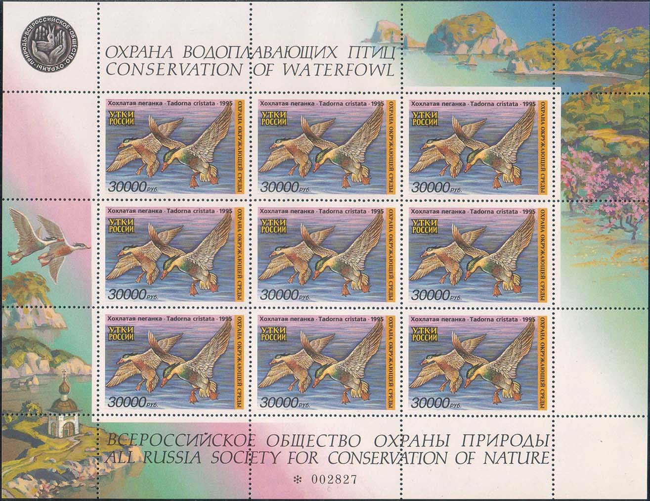 1995 г. Разм. рис. 47,5 х 32,5 мм. Многоцветная печать на белой мелованной бумаге. Зубц. 12 1/4. С клеем. Две утки над водоемом. Сверху текст: «Хохлатая пеганка» и латинское название данного вида уток и дата: «1995». В левом верхнем углу текст в две строки: «Утки России». В правом нижнем углу ном…