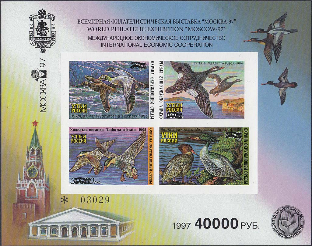 1997 г. Листок разм. 172 х 137 мм. Многоцветная печать на белой мелованной бумаге. В центре четыре марки предыдущих выпусков. Номиналы марок забиты волнистыми линиями. На полях листов различные виды Москвы. Слева логотип филвыстваки «Москва 97». Сверху текст в две строки на русском и английском …