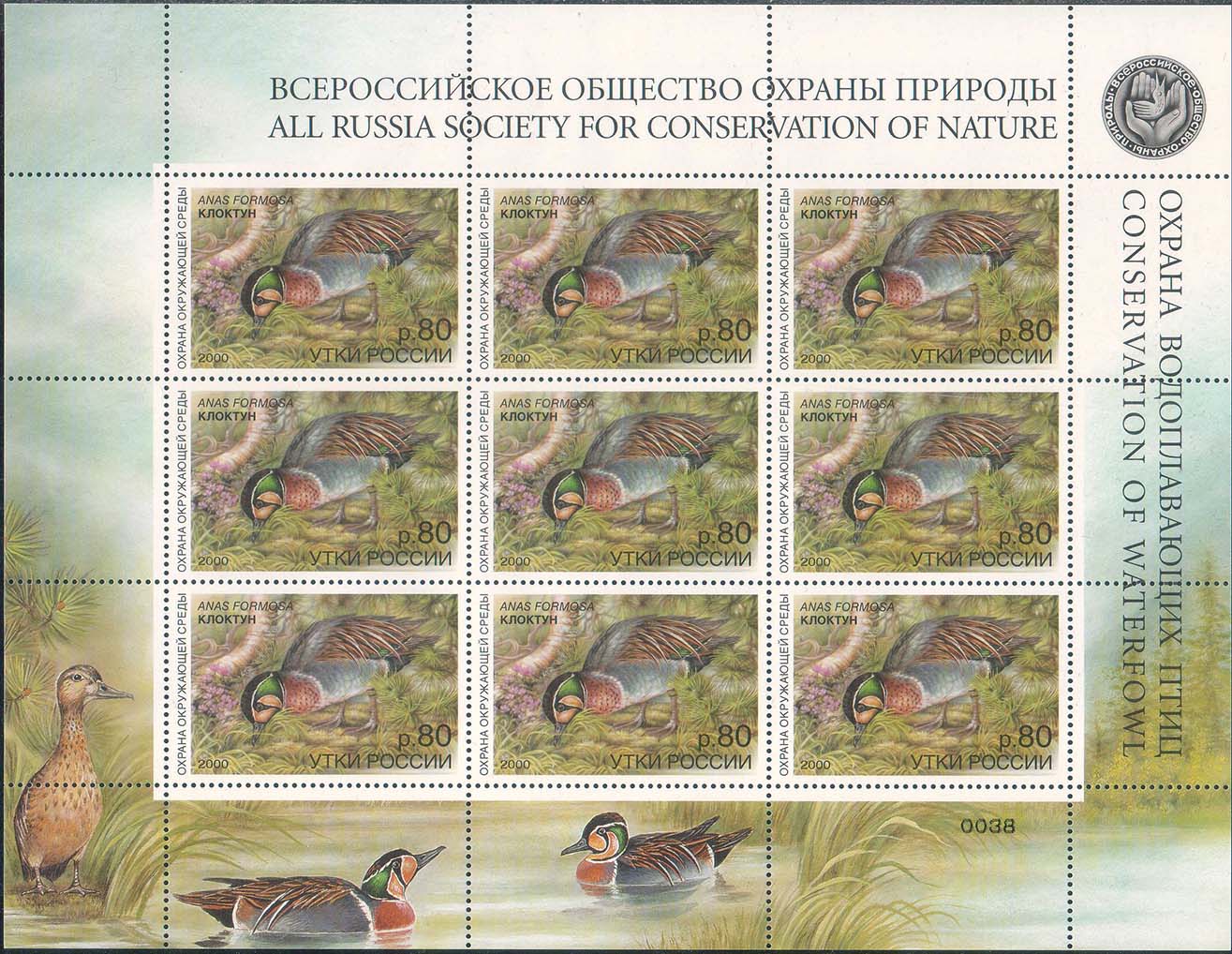 2000 г. Разм. рис. 47,5 х 32 мм. Многоцветная печать на белой мелованной бумаге. Зубц. 12 1/4. С клеем. Утка в траве. В левом верхнем углу текст: «Клоктун» и латинское название данного вида уток. В левом нижнем углу дата: «2000». В правом нижнем углу номинал и текст: «Утки России». Слева вертика…