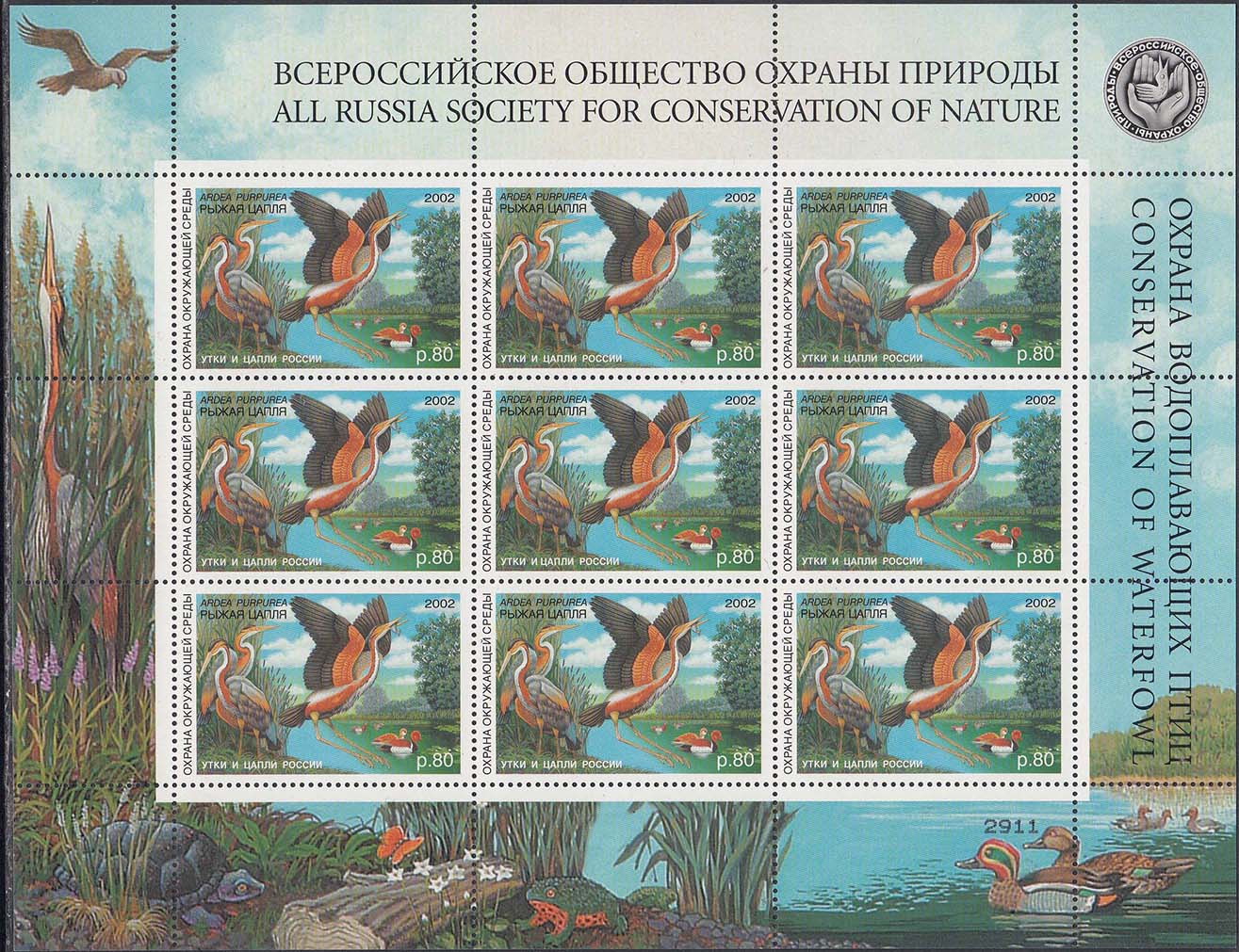 2002 г. Разм. рис. ≈ 47 х 32 мм. Многоцветная печать на белой мелованной бумаге. Зубц. 12 1/4. С клеем. В центре Цапля на фоне реки. В левом верхнем углу текст: «Рыжая цапля» и латинское название данного вида птиц. В правом верхнем углу дата: «2002». В левом нижнем углу номинал и текст: «Утки и …