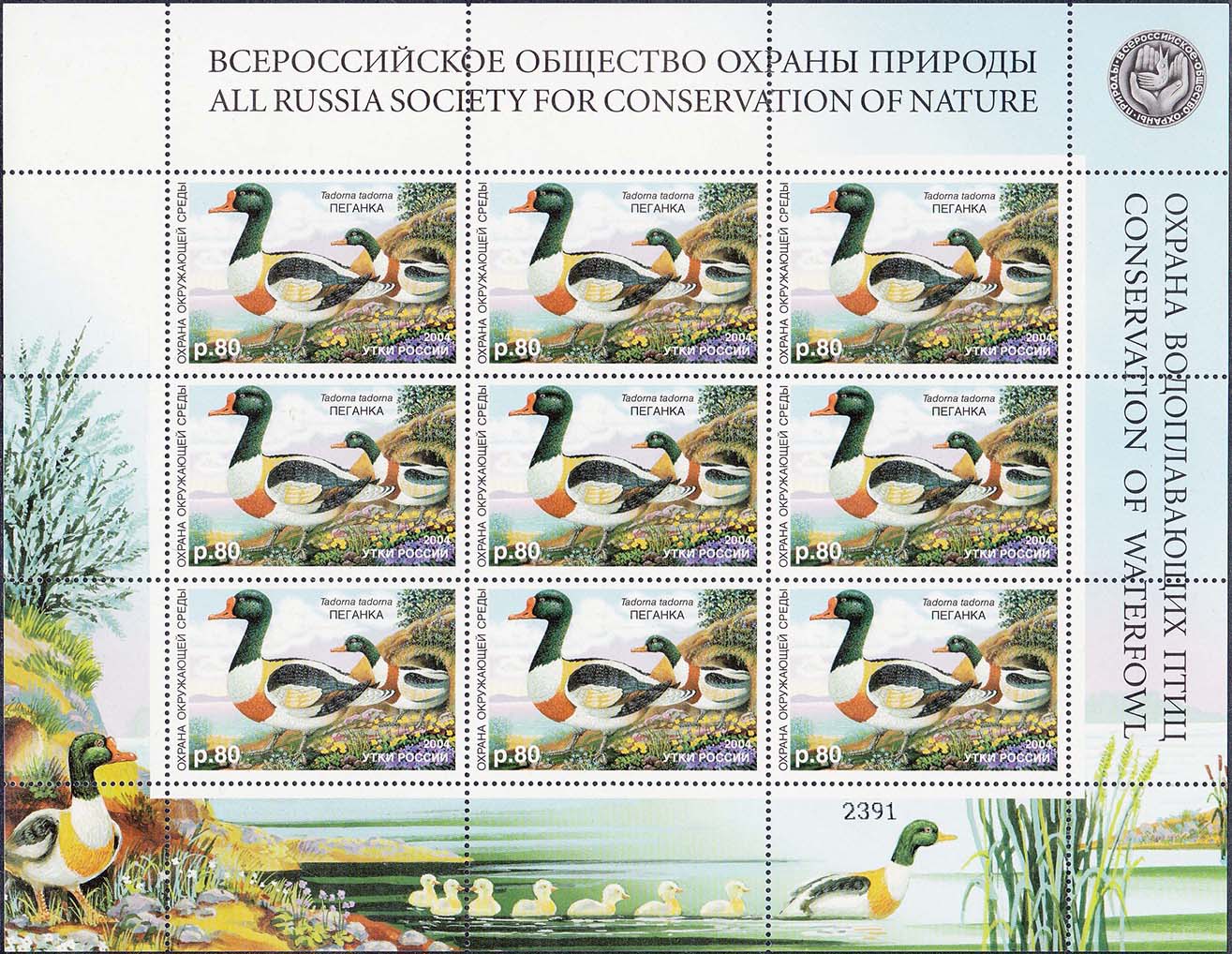 2004 г. Разм. рис. 47,5 х 32 мм. Многоцветная печать на белой мелованной бумаге. Зубц. 12 1/4. С клеем. В центре две утки на берегу. В правом верхнем углу текст: «Пеганка» и латинское название данного вида уток. В левом нижнем номинал. В правом нижнем углу текст в две строки: «2004 Утки России».…