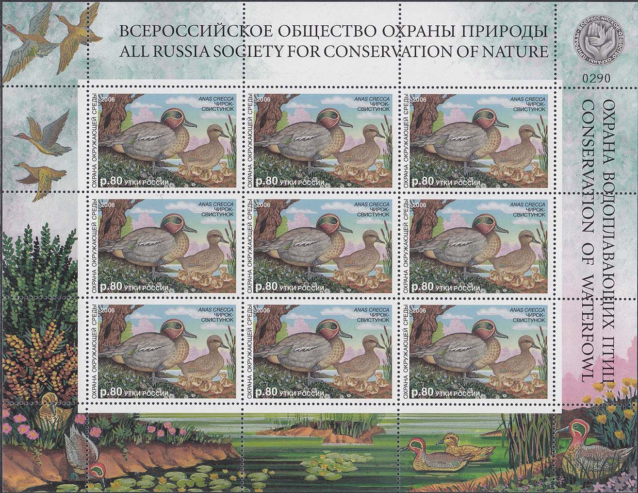 2006 г. Разм. рис. 47,5 х 32 мм. Многоцветная печать на белой мелованной бумаге. Зубц. 12 1/4. С клеем. В центре две утки на берегу. В левом верхнем углу дата: «2006» В левом верхнем углу текст: «Чирок свистунок» и латинское название данного вида уток. В левом нижнем углу номинал и текст: «Утки …