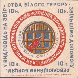 1932 г. Разм. 54 х 54 мм. Трехцветная печать на серо-голубоватой бумаге. В рамке из концентрических окружностей диаметром 39 мм в центре эмблема МОПР. Между рамками по окружности текст: «Криворожская организация. Да здравствует интернационально-классовая солидарность трудящихся». По периметру тек…