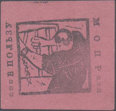 1925 г. 04.01.1925 г. Разм. 61 х 59 мм. Одноцветная печать на красно-розовой бумаге. В центре в прямоугольной рамке разм. 39 х 40 мм заключенный разгибает прутья решетки. Слева и справа вертикально текст: «В пользу МОПР».