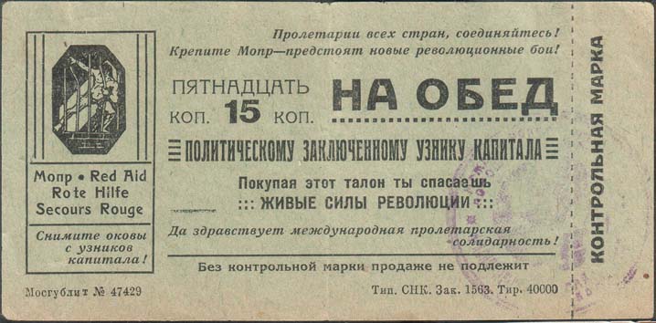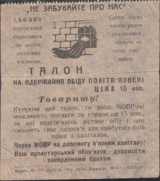 1929(?) г. Листок разм. 121 х 60 мм. Одноцветная печать на плотной желто-зеленой бумаге. В центре текст в восемь строк: «Пролетарии всех стран, соединяйтесь! Крепите МОПР – предстоят новые революционные бои! Пятнадцать коп. Но обед политическому заключенному узнику капитала. Покупая этот талон ты…