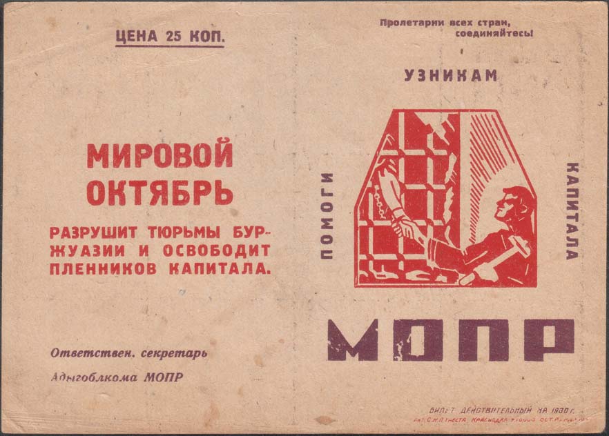 1929 г. Листок разм. 148 х 105 мм. Трехцветная двухсторонняя печать на толстой желтоватой бумаге. На лицевой стороне слева в центре текст в пять строк: «Мировой октябрь разрушит тюрьмы буржуазии и освободит пленников капитала». Сверху текст: «Цена 25 коп.». Внизу текст в две строки: «Ответствен[н…