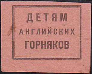 1926 г. Разм. 51 х 40 мм. Одноцветная печать на розово-серой бумаге. В центре в двойной прямоугольной рамке разм. 39 х 40 мм текст в три строки: «Детям английских горняков».