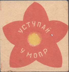 1924 г. 01.05.1924 г. Разм. 51 х 68 мм. Одноцветная печать на плот-ной бумаге различных цветов. В центре в прямоугольной рамке разм. 39 х 59 мм в центре эмблема МОПР. Сверху текст в три строки: «Твой революционный долг – на помощь пленникам капитала!». Внизу аббревиатура «МОПР».