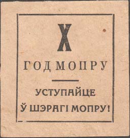 1932 г. Разм. 42 х 47 мм. Одноцветная печать на рыхлой желтоватой бумаге. В двойной прямоугольной рамке разм. 33 х 36 мм сверху текст в две строки на белорусском языке: «X лет МОПРу». В центре горизонтальная черта. Внизу текст в две строки на белорусском языке: «Вступайте в кружки МОПРа!».