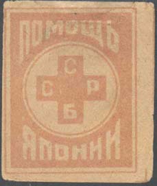 1930(?) г. Разм. рамки 32,5 х 40,5 мм. Одноцветная печать на тонкой желтоватой бумаге. В центре в круглой рамке диаметром 24 мм знак красного креста с буквами аббревиатуры «ССРБ» на перекладинах. Сверху текст: «Помощь». Внизу продолжение текста: «Японии».