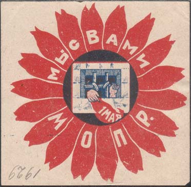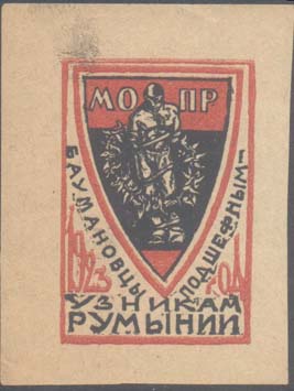 1923 г. Разм. 44 х 58 мм. Двухцветная печать на желтоватой бумаге. В центре в прямоугольной рамке разм. 30 х 44 мм треугольный щиток, на котором заключенный и аббревиатура «МОПР». Внизу по наружной рамке щитка текст: «Баумановцы подшефным». Внизу продолжение текста в две строки: «Узникам Румынии»…