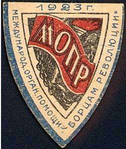 0 г. Разм. 34 х 45 мм. Трехцветная печать на плотном желтоватом картоне. В центре эмблема МОПР (ранний вариант). Внизу дата: «1923 г.» и текст в четыре строки: «Международ[ная]. орган[изация]. помощи борцам революции».