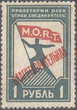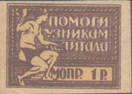 1924 г. Всесоюзный выпуск. Разм. рамки 27,5 х 20 мм. Двухцветная печать на кремовой бумаге. С просечкой и Б.З. В центре в прямоугольной рамке рабочий выбивает на стене молотком и зубилом текст в три строки: «Помоги узникам капитала». Внизу аббревиатура «МОПР» и номинал.