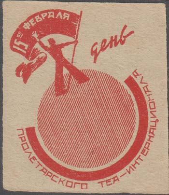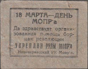 1930(?) г. Разм. 52 х 40 мм. Одноцветная печать на толстой серо-синей бумаге низкого качества. В двойной прямоугольной рамке разм. 40 х 28 мм текст в семь строк: «18 марта – день МОПРа. Да здравствует организованная помощь борцам революции. Укрепляй ряды МОПРа. Новочеркасский РК Мопра».