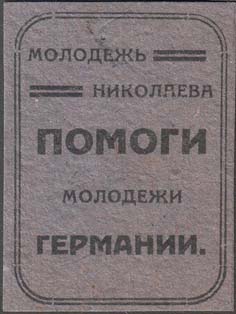 1930(?) г. Разм. 40 х 53 мм. Одноцветная печать на толстой серо-синей бумаге. В двойной прямоугольной рамке разм. 35 х 48 мм с закругленными краями в центре текст в пять строк: «Молодежь Николаева помоги молодежи Германии».