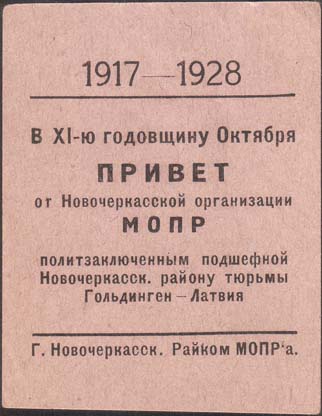 1928 г. Разм. 54 х 70 мм. Одноцветная печать на бумаге различных цветов. В центре текст в семь строк: «В XI-ю годовщину Октября Привет от Новочеркасской организации МОПР политзаключенным подшефной Новочеркасск[ому]. району тюрьмы Гольдиген - Латвия». Сверху над вертикальной чертой текст: «1917 - …
