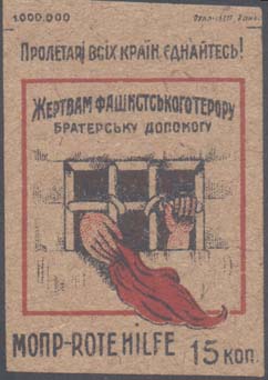 1930(?) г. Разм. 40 х 56 мм. Двухцветная печать на серо-желтой бумаге-отходах обойного производства. В центре в прямоугольной рамке разм. 34 х 36 мм эмблема МОПР. Сверху внутри рамки текст в две строки на украинском языке: «Жертвам фашистского террора братскую помощь». Сверху над рамкой текст н…