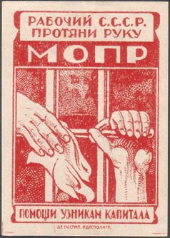 1930(?) г. Разм. рамки 34 х 50 мм. Одноцветная печать на белой гладкой бумаге. В прямоугольной декоративной рамке в центре эмблема МОПР. Сверху аббревиатура: «МОПР». Выше текст в две строки: «Рабочий С.С.С.Р. протяни руку». Внизу продолжение текста: «Помощи узникам капитала». Внизу под рамкой вых…