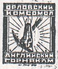 1926(?) г. Разм. 27 х 31 мм. Одноцветная печать на светло-серо-желтой бумаге. В рамке разм. 22 х 25 мм шахтерская лампа и кирка на фоне солнца с лучами. Сверху текст в две строки: «Орловский комсомол». Внизу продолжение текста в две строки: «Английским горнякам». Внизу под рамкой выходные данные …