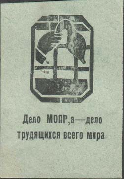 1927 г. Разм. ≈ 45 х 55 мм. Одноцветная печать на бумаге различных цветов и плотности. В центре эмблема МОПР. Внизу различные тексты.