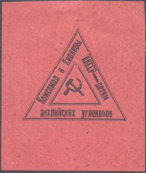 1926 г. Разм. 50 х 60 мм. Одноцветная печать на плот-ной розово-красной бумаге. В центре в двойной треугольной рамке разм. 36 х 37 мм серп и молот. По периметру между рамками текст: «Комсомол и Пионеры АКССР – Детям английских углекопов».