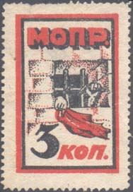 1930 г. 01.11.1930 г. Разм. ≈ 36 х 34 мм. Одноцветная печать на желтоватой бумаге с мелованным верхним слоем. Фиолетовый оттиск штампа, в котором в двойной прямоугольной рамке разм. 30 х 27 мм в центре эмблема МОПР. Слева и справа вертикально номинал. Внизу аббревиатура: «МОПР».