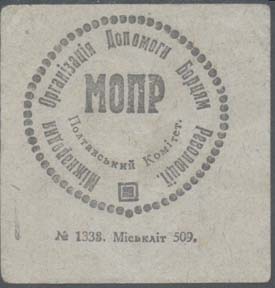 1931 г. 07.11.1931 г. Разм. 46 х 48 мм. Одноцветная печать на серо-зеленой бумаге. В центре в круглой декоративной рамке диаметром 35 мм текст в две строки на украинском языке: «МОПР Полтавский Комитет». По внутреннему периметру рамки текст на украинском языке: «Международная Организация Помощи Бо…