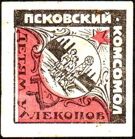 1926 г. 08.08.1926 г. Ромб разм. рамки 55 х 55 мм. Одноцветная и двухцветная печать на плотной белой (оттенки) бумаге. В центре в круглой рамке женщина и двое детей на фоне угольной шахты. Сверху пятиконечная звезда с лучами. Внизу серп и молот. По внутреннему периметру таки текст: «Псковский комс…