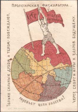 1924 г. 06-07.09.1924 г. Разм. 44 х 63 мм. Многоцветная печать на толстой белой полуглянцевой бумаге. В центре аллегорический сюжет: земной шар в цепях на котором флаг с текстом: «СССР. Неделя физкультуры» и фигура спортсмена, разбивающего цепи. По периметру текст: «Только сильные духом и телом – …