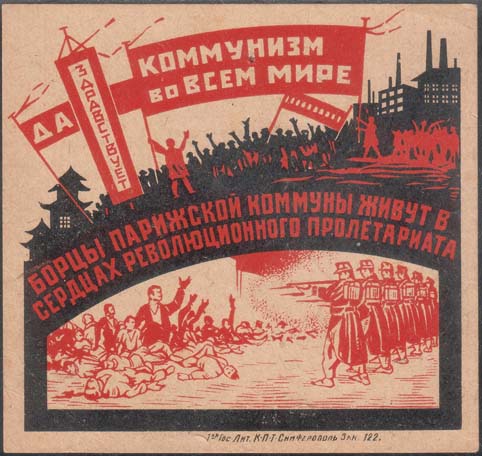 1926(?) г. Разм. 66 x 89 мм. Одноцветная печать на белой бумаге. В прямоугольной пунктирной рамке разм. 50 x 72,5 мм в центре кирка. Сверху текст в две строки: «Трудящаяся молодежь г. Симферополя!». Внизу продолжение текста: «Английским рабочим». По бокам снаружи рамки вертикально текст: «Трехдне…