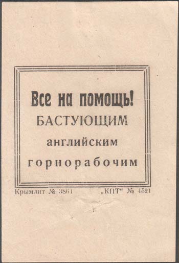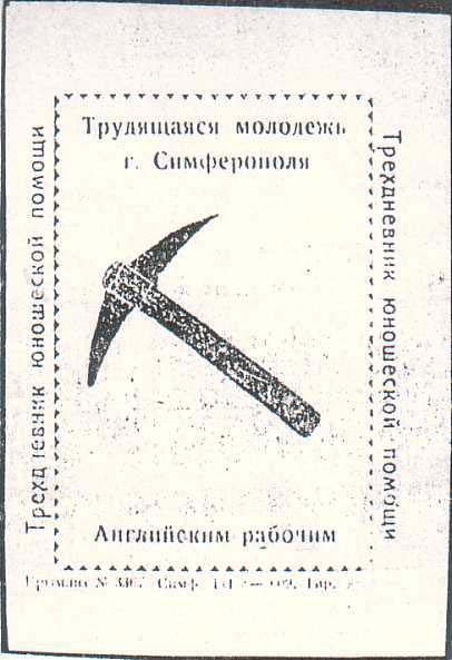 1926 г. Разм. рамки 44 х 40 мм. Одноцветная печать на бумаге различных цветов и качества. В тройной прямоугольной рамке текст в три строки: «Все на помощь! Бастующим английским горнорабочим». Под рамкой мелким шрифтом выходные данные: «Крымлит №3861 «КПТ» №4521».