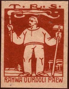 1917 г. 19-20.08.1917 г. Разм. рамки 33 х 38 мм. Одноцветная печать на желтоватой бумаге. В прямоугольной рамке в центре рабочий с горящим факелом и молотом. Сверху аббревиатура на эстонском языке: «T.R.S.». Внизу текст на эстонском языке.