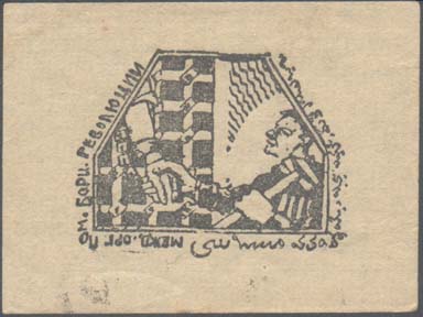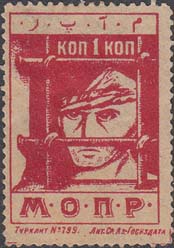 1930(?) г. Разм. 64 х 46 мм. Одноцветная печать на желтоватой бумаге. В центре в пятиугольной рамке разм. 36 х 28 мм эмблема МОПР. По пери-метру рамки тест на русском и узбекском (арабским шрифтом) языках: «Межд[ународная]. Орг[анизация]. Пом[ощи]. Борц[ам]. Революции».
