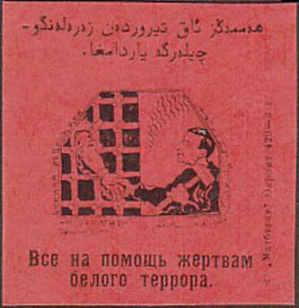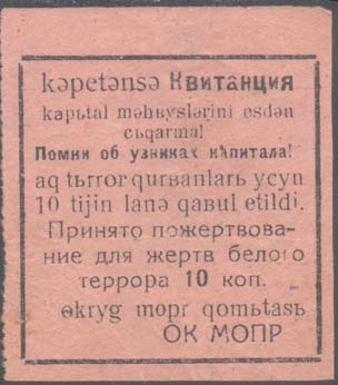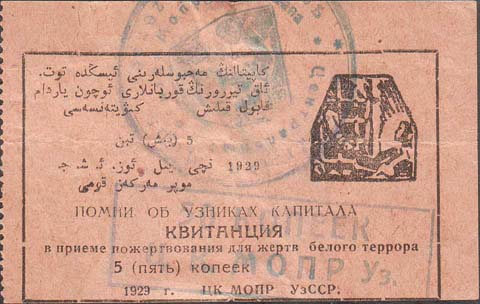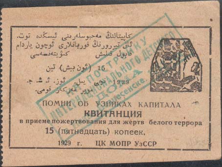 1931 г. Август. Листок из квитанционной книжки разм. 50 х 57 мм. Одноцветная печать на тонкой розово-серой бумаге. Левосторонняя нерегулярная зубц. В центре в прямоугольной рамке разм. 46 х 47 мм текст на русском и узбекском (латинской шрифтом) языках: «Квитанция. Помни об узниках капитала! Принят…