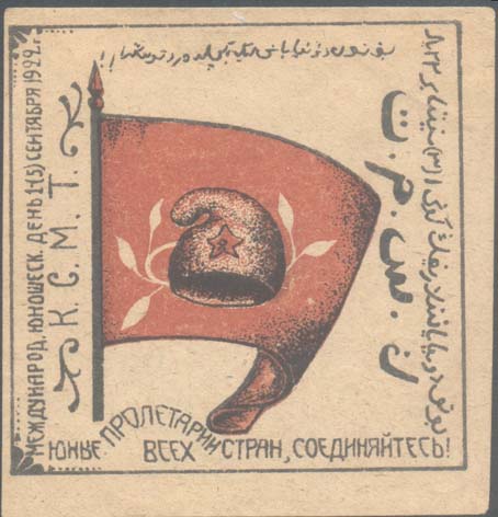 1922 г. 01.-05.09.1922 г. Разм. 76 х 78 мм. Двухцветная печать на желтоватой бумаге. В центре в прямоугольной рамке разм. 70 х 69 мм красный флаг с фригийским колпаком в центре. Слева вертикально текст в две строки: «Международ[ный]. Юношеск[ий]. День 1- (5) сентября 1922 г. К.С.М.Т.». Внизу текст…