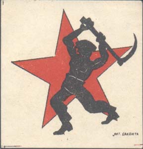 1926 г. Разм. 49 х 49 мм. Двухцветная печать на белой бумаге. В центре на фоне пятиконечной звезды силуэт рабочего с занесенной для удара киркой. Справа внизу мелким шрифтом выходные данные: «Лит. Сакомта». По углам знака разграничительные линии.