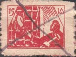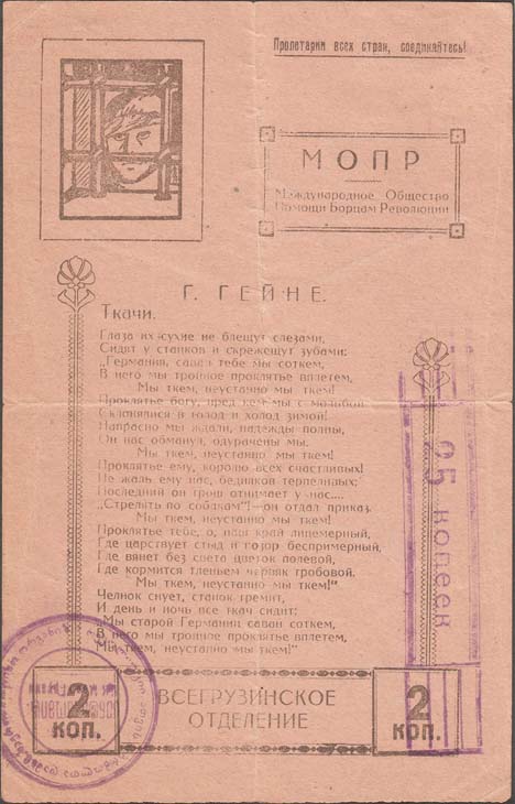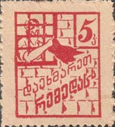 1925(?) г. Разм. рамки 20 х 25 мм. Одноцветная печать на белой бумаге. Зубц. 11 1/2. С клеем. 54 х 60 мм. В прямоугольной рамке эмблема МОПР. В правом верхнем углу номинал. Внизу по диагонали текст в две строки на грузинском языке: «Разобьем цепи».
